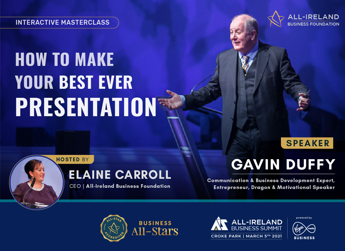 Gavin Duffy is best known for his work with entrepreneurs on all eight series of RTE’s Dragons’ Den. Behind the scenes, he has spent the past 35 years delivering consultancy, leadership and business development to SMEs, start-ups, corporations and social change entities. He has coached and advised a number of the country's top CEOs and Managing Partners about getting their message across in Presentations.